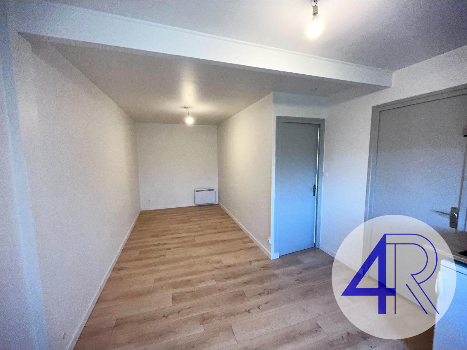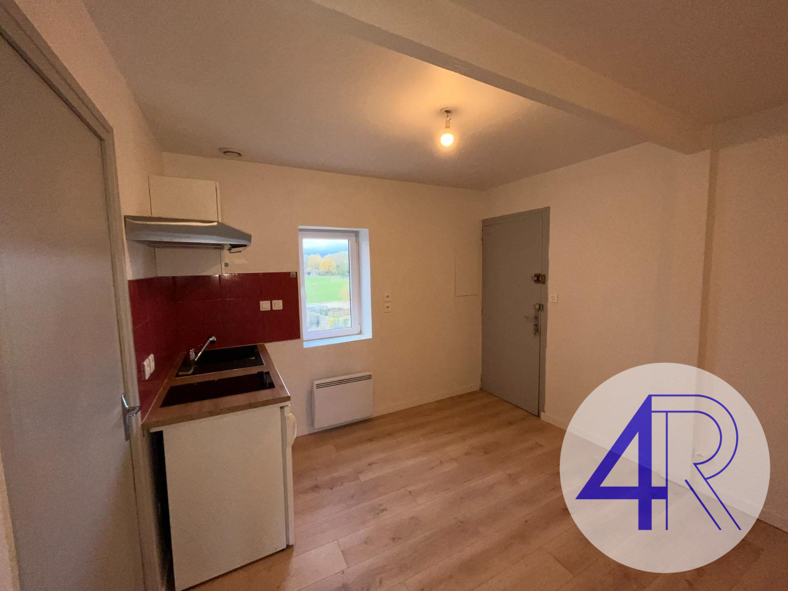 Une pièce principale avec coin cuisine équipée (plaque de cuisson, hotte et réfrigérateur), une chambre avec placard aménagé et une salle d’eau.